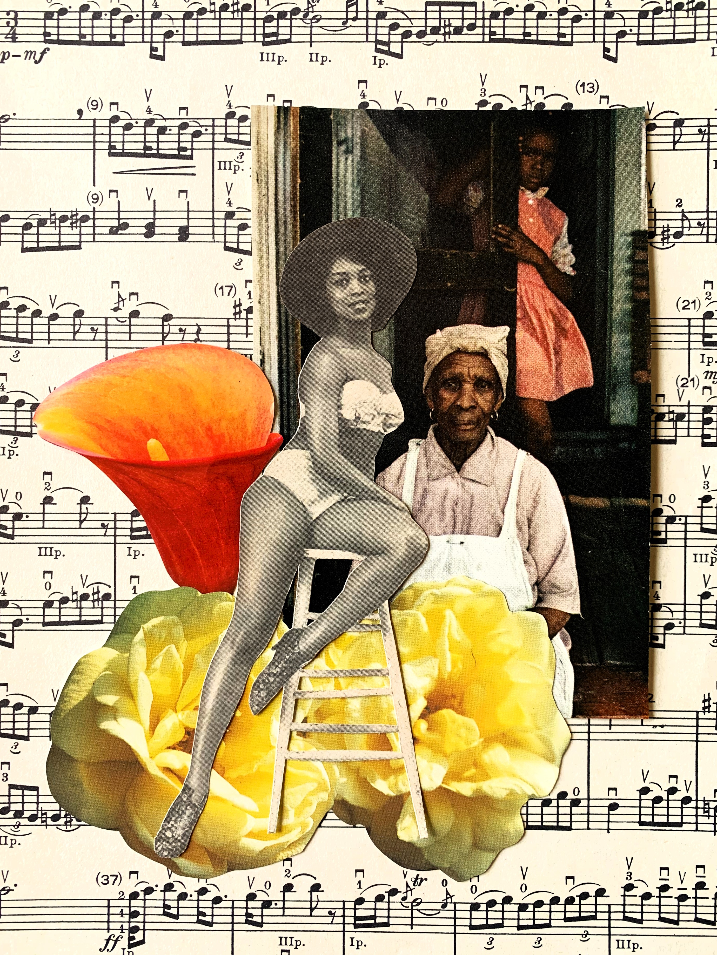 Paper is an extension of my physical and spiritual self. As an analog collagist, I build words in which Black people exist freely within the land, among the stars and everywhere in between. My work seeks to explore the beauties and complexities of being an imaginative Black queer woman and descendent of farmers who chose to remain in rural Georgia to grow, thrive and create. I rely on current and archival images of my people and surround them with vibrant colors and details as a way to explore the juxtaposition of the past, present and future existing simultaneously–a visual representation of how ancestral stories were passed down to me, how my life will contribute to those stories, and how they will carry on after I am gone.